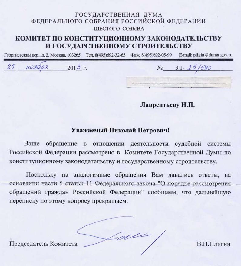 29. Принципы справедливости и гуманизма в первую очередь должны применяться не к обвиняемым, а к потерпевшим и к истцам, которые по всем процессуальным законам, бесправны. Им по воле прокуроров в судах отказывают в ходатайствах, например, о возврате мошенниками денег. Это же, якобы, может ухудшить положение обвиняемого. Если депутаты Госдумы сочиняют законы во вред своим избирателям, но в пользу коррупционной мафии, то кто они? http://www.litsovet.ru/index.php/material.read?material_id=424428 ИЗБАВИТЬ ОБЩЕСТВО ОТ ЗЛА СУДЕЙ Простосердовой Т.М., Фокиной Т.К. и ДРУГИХ ОБОРОТНЕЙ! 30. Ни одна статья в процессуальных кодексах не говорит об улучшении положения потерпевшего истца. Если, например, потерпевший через суд взыскал с финансовой пирамиды свой пай или вклад до уголовного суда, заплатив госпошлину, то он не получит ничего, ибо согласно части 3 статьи 76 закона «Об исполнительном производстве» финансовая пирамида улетучивается. Потерпевшему истцу государство Россия не вернёт даже госпошлину. В конце судебного разбирательства оказывается, что виновна не финансовая пирамида (КПКГ), а её директор. Но с него, даже если он украл деньги с помощью поддельных подписей, ничего не взыщут, ибо договор составлялся с пирамидой, а не с ним. Судьи отвечают, что если взыщут с виновного, кто с гражданским иском ранее обращался, то это будет двойное взыскание. 31. Кто виновен в этом: Госдума, судья или прокурор? Государство за данный грабёж не отвечает, так договор был не с государственным банком, а с КПКГ, организованным частным лицом, которому хоть и помогало грабить людей государство в лице Госдумы, судей и прокуроров. Полгода отписок от них и… срок обжалования закончился. Это по-демократически? Данный пример из жизни ещё раз доказывает то, что, к народному сожалению, наше государство Россия не демократическое, а хуже, чем коррупционное. В России установлена «демократия» – диктатура независимых от Конституции РФ мошенников при власти. 32. Вот ещё одна отписка из Госдумы по существу, ибо я обращался не только для защиты своих прав и интересов, в которых суд и прокуроры отказали с помощью лжи и фальсификации, что не опровергнуто, но и для усовершенствования законов. Ответ из Госдумы на жалобы, что, игнорируя законы, факты, документы, логику и доводы, Верховный Суд и Генеральная прокуратура голословно или с помощью лжи, фальсификации, без опровержения доводов не принимают жалобы к производству: «Государственная Дума Федерального Собрания Российской Федерации . Аппарат государственной Думы, Отдел по обеспечению деятельности приёмной государственной думы управления информационно-технологического и документационного обеспечения _______ул. Моховая, д. 7, Москва, 103265 Тел. (495) 629-68-27, (495) 629-65-04 Факс (495) 697-42-58______________ 16.03.2016 № 2.8-15-5377 Н.П. Лаврентьеву Рассмотрев поступившее в Государственную Думу Федерального Собрания Российской Федерации Ваше обращение, сообщаем, что на основе установленного статьёй 10 Конституции Российской Федерации разделения государственной власти на законодательную, исполнительную и судебную. Государственная Дума не наделена ни контрольными, ни распорядительными полномочиями в отношении органов прокуратуры и суда, действия которых Вы обжалуете. Судебная власть в Российской Федерации самостоятельна и действует независимо от законодательной и исполнительной властей, 