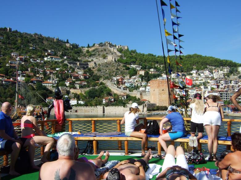 Катание на пиратском корабле - 18$ с человека. Обед включен. У причала стоит порядка 20-30 таких кораблей. Корабль останавливается в море, люди купаются. Анимация. Пенное шоу и танцы. |