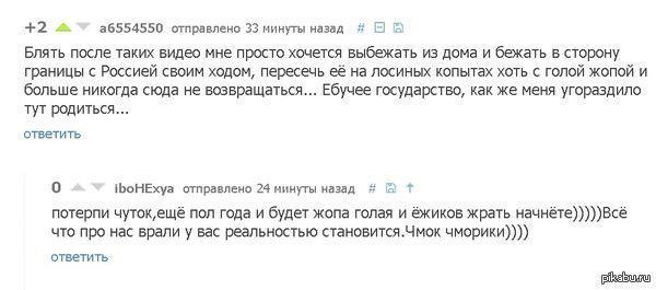 Хотлось бы сказать "украинскому народу насмотревшемуся видео " - не нужно бегать лосем к России. Не лучше ли собрать чаймоданчик - и на Рассею - спокойно без нервов. И главное ж - поезда ходят. зачем лосиным галопом бегать.